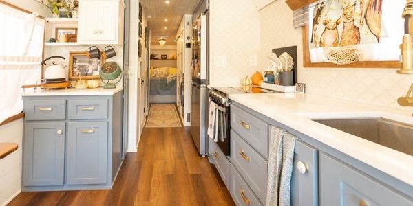 go-getter that dreams an incredible dream even though he rarely takes time to rest; I’m determined, creative, whimsical, and seek to sprinkle love and adventure everywhere. Then there’s Oscar, the best boy that keeps us light, fluffy, safe, and grounded, all together in a sweet, 232 Sqft. 1989, Silver Eagle Coach, that we transformed into a mobile living sanctuary!